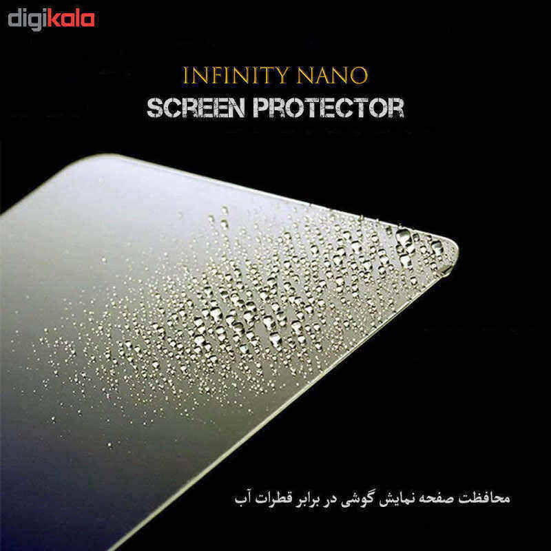 محافظ صفحه نمایش انعطاف پذیر نانو اینفینیتی ، گلسی با ساختار شفاف و بدون حاشیه رنگی که توسط فناوری نانو ساخته شده و از ضخامت 0.2 میلی متری می باشد. محافظ صفحه نمایش اینفینیتی, نسل جدید محافظ های صفحه نمایش گوشی که از تکنولوژی نانو در ساخت آن استفاده شده است و باعث مقاومت بسیار بیشتر در برابر ضربه نسبت به گلس های معمولی شده است همچنین کاملا نشکن است (شیشه ای نمی باشد) و در صورت برخورد ضربه نخواهد شکست بسیار شفاف است و به مرور زمان کدر نخواهد شد و لمس آن با توجه به ساختار تکنولوژی روغنی بسیار آسان و روان است. محافظ صفحه نمایش نانو اینفینیتی قسمت های خمیده (curved) صفحه گوشی را پوشش نمیدهد اما برای گوشی هایی که خمیدگی ندارند، صفحه نمایش را به خوبی پوشش میدهد.همچنین این محصول سازگاری کامل با تمامی بک کاور های موجود در بازار را دارد به این دلیل که تنها حدود 90 درصد صفحه نمایش را در بر می گیرد و پس از استفاده از کاور لبه های محافظ بلند نمیشود.توجه داشته باشید که این محافظ دارای برچسب اول (قبل از نصب) و برچسب دوم (بعد از نصب) می باشد و رنگ اصلی محصول کاملا بدون حاشیه رنگی و شفاف می باشد. برچسب پوششی صدفی اینفینیتی که از عناوین دیگر آن میتوان به استیکر و یا برپوش اکلیلی اشاره کرد که به منظور پوشش پشت گوشی موبایل شما طراحی و تولید شده و کنارههای دستگاه را پوشش نمی دهد. هدف استفاده از آن محافظت از خط و خش های احتمالی و همچنین ایجاد رنگ و طرحی نو برای تلفن همراه می باشد در حالي كه هیچگونه تغییری در طراحي و ظرافت گوشي شما احساس نشود. برپوش صدفی اینفینیتی که از آن صحبت شد با محصولات مشابه کاملا متفاوت است. این محصول انعطاف پذیر و نشکن می باشد و همچنین امکان استفاده همزمان از برپوش و گارد وجود دارد.جنس برپوش از PVC بوده و از آنجایی که برای ساخت آن رنگ و اکلیل را با پی وی سی مخلوط میکنند و در اصطلاح رنگ به خورد PVC میرود ، اکلیل ها از رنگ جدا نمیشوند و ثابت باقی می مانند و هنگام انعکاس نور ، زرق و برق خاصی به پشت گوشی شما می بخشد. شایان ذکر است که برپوش صدفی اینفینیتی کاملا منطبق با گوشی شما طراحی شده و تمامی سنسور ها و لنز دوربین برش خورده است و با وجود چسبندگي بالا هيچي اثري از خود هنگام جدا شدن برجاي نميگذارد.